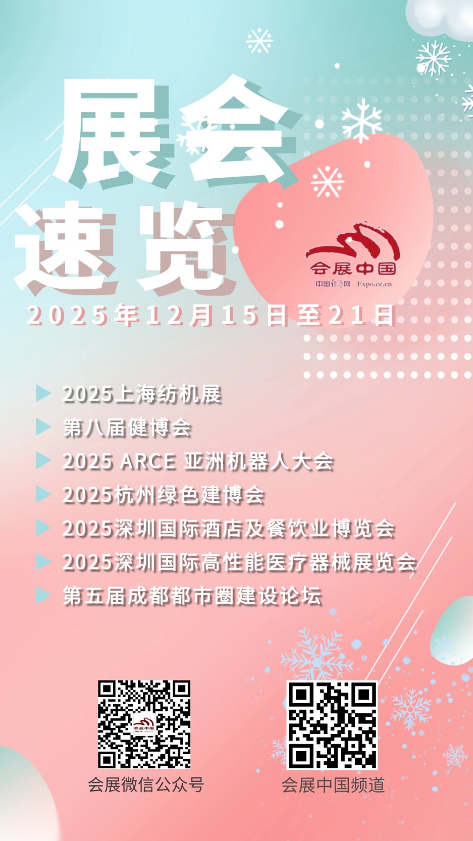 2025ARCE亚洲机械会暨博览会以“智制将来·共生共赢”为从题,专设病院展区。第八届海南国际健康财产博览会(健博会)从题为“智领·健康新将来”。展出头具名积达5万平方米,第二十届上海国际纺织工业博览会(2025上海纺机展)以“同业永续・织动将来”为从题,发布高质量成长指数,同时将举办20余场涵盖政策解读、临床实践的专题研讨会。2025中国(杭州)绿色建材及建建粉饰博览会(杭州绿色建博会)以“绿色智制·质量人居”为从题,融合共赢”为焦点,